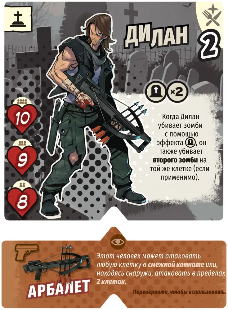 Новое снаряжение, добавляемое дополнением, расширяет арсенал людей. Это особый жетон, который усиливает атакующий потенциал выживших и позволяет им эффективнее убивать зомби, особенно опасные типы мутантов. В сценариях с Диланом вам придётся учитывать, где и когда активируется это снаряжение: неверно выбранное направление атаки орды может обернуться тем, что часть ваших мертвецов просто не дойдёт до «шведского стола» из живых.