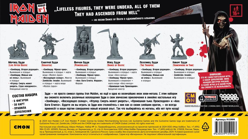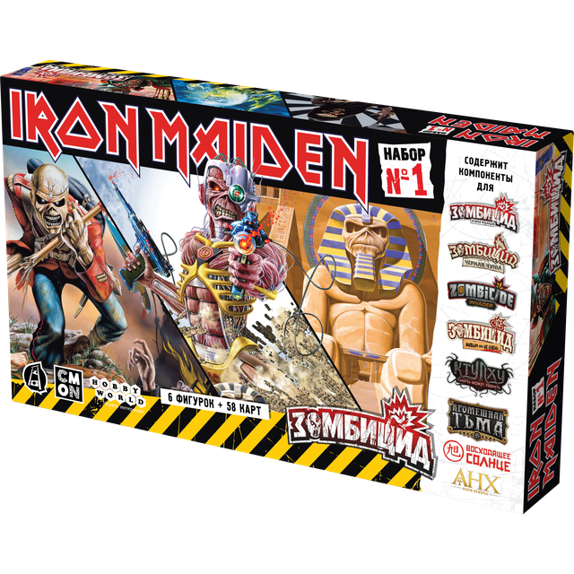 «Зомбицид: Iron Maiden. Набор №1» — тематическое дополнение, созданное для поклонников хеви‑метала и настольных игр одновременно. В центре набора стоит легендарный Эдди — узнаваемый маскот группы Iron Maiden, который десятилетиями украшает обложки альбомов и постеры, а теперь получает собственное настольное воплощение. С этим набором Эдди становится полноценным персонажем в ваших партиях, причём не только в «Зомбициде», но и в других известных играх студии CMON. Дополнение превращает каждую сессию в своеобразный кроссовер между миром настолок и атмосферой классического металла.​