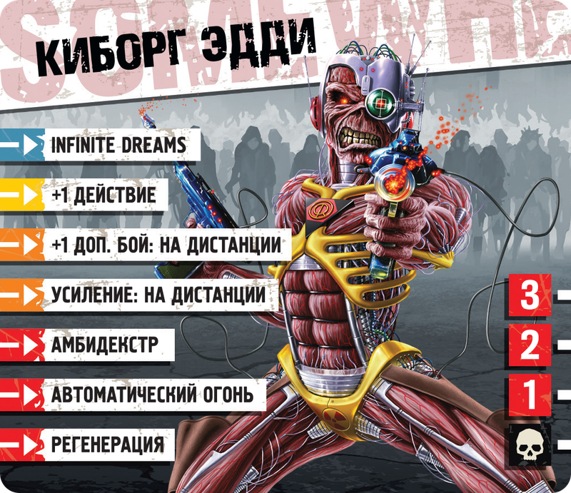 Атмосферно «Зомбицид: Iron Maiden. Набор №1» создаёт эффект живого концерта в мире настолок. Эдди — персонаж яркий, провокационный и запоминающийся, и его присутствие в партиях усиливает ощущение драйва и безумия происходящего. Независимо от того, сражаетесь ли вы с ордами зомби, древними божествами, мифическими чудищами или противниками в стратегических баталиях, участие Эдди делает каждую историю более необычной. Это дополнение особенно оценят компании, где есть фанаты Iron Maiden и игроков, уже знакомых с серией Зомбицид и другими проектами CMON.​